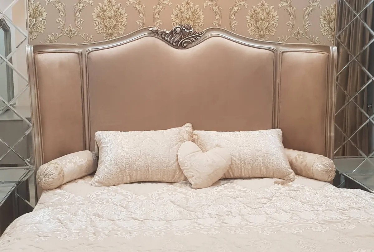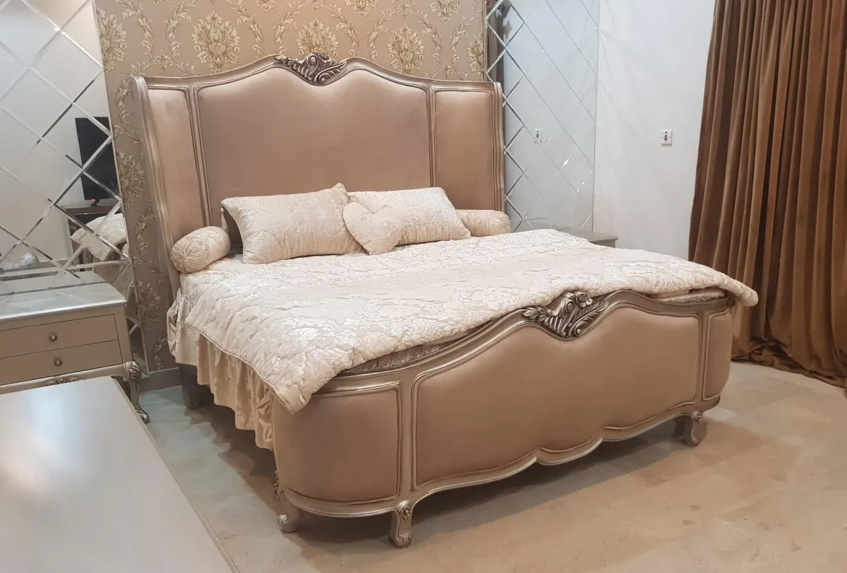 Indulge in the ultimate luxury with our Chinioti bed set design CBD10, a piece that perfectly captures the Victorian influence within traditional chiniot furniture design. This set features a magnificent, extra-tall headboard with smooth, high-quality upholstery, framed by delicate hand-carved Sheesham wood borders. Built as a solid wood wooden simple chiniot furniture masterpiece, it offers the structural integrity that seasoned Sheesham wood is known for throughout the chiniot furniture market.
