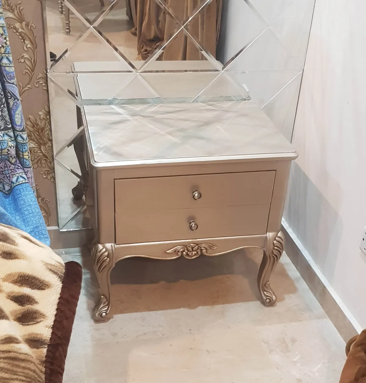 The soft champagne gold finish provides a stylish bedroom chiniot furniture design that is both opulent and calming. Unlike heavier traditional carvings, this model uses sleek, flowing lines and a central floral crest, making it an excellent choice for those seeking wooden simple chiniot furniture with a high-end designer look. The matching side tables and minimalist carving details ensure that this chiniot furniture set remains timeless. Whether you are furnishing a new bridal suite or upgrading your home, this bed set offers the elegance of simple chiniot furniture with a truly royal presence.