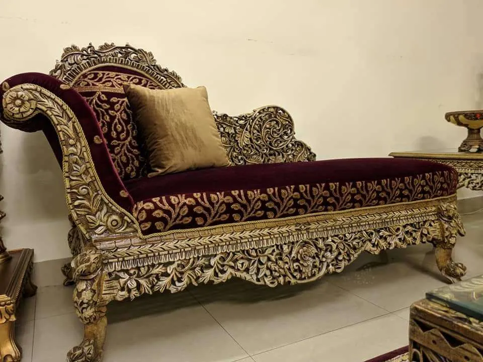If you want to transform your home into a shahi palace, this sofa chiniot furniture piece is the perfect choice. The rich maroon velvet is paired with embroidered borders on the seat and back, creating a stylish bedroom chiniot furniture design that exudes wealth and comfort. This Chiniot furniture design is famous for its “Taj” style headrest and curved silhouette, which provide a regal atmosphere. Its solid wood construction ensures long-term stability while the intricate craftsmanship guarantees that it will be the focal point of any formal gathering.