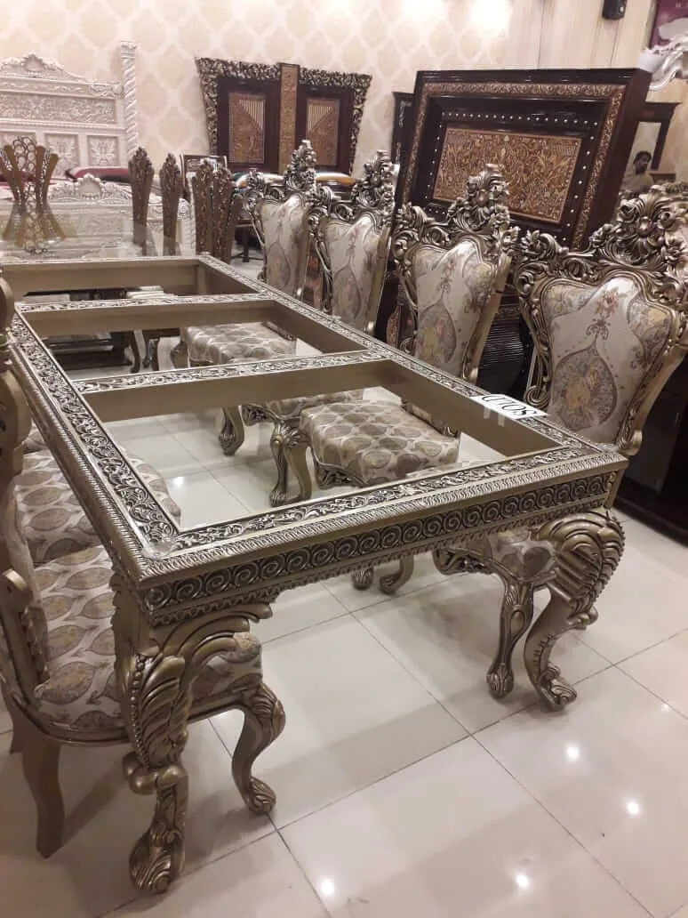 If you are looking for a sofa chiniot furniture level of luxury in your dining room, these high-back chairs with premium cream damask upholstery are the perfect choice. The fabric features elegant floral motifs that complement the stylish bedroom chiniot furniture design themes found in luxury homes. The table is supported by a massive hand-carved pedestal base, providing superior stability and a majestic presence. This solid wood construction and the brilliant shahi finish make it an ideal choice for formal family dinners and royal hosting events.