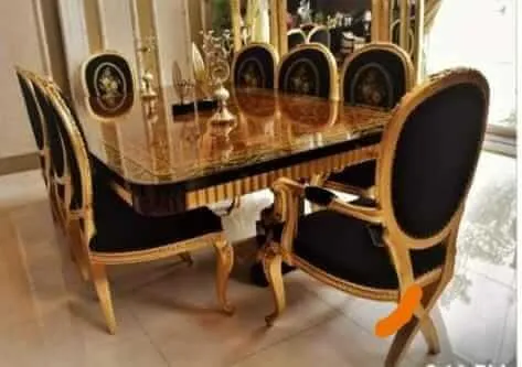 If you are looking for a sofa chiniot furniture level of luxury for your dining hall, these high-back chairs with plush velvet are the perfect choice. The backrests feature elegant cushioning, a style inspired by stylish bedroom chiniot furniture design, now adapted for a grand dining hall experience. The table stands on a massive hand-carved double-pedestal base, providing superior stability and a majestic presence. This solid wood construction and the brilliant antique gold finish make it an ideal choice for formal family dinners and royal hosting events where a shahi atmosphere is desired.