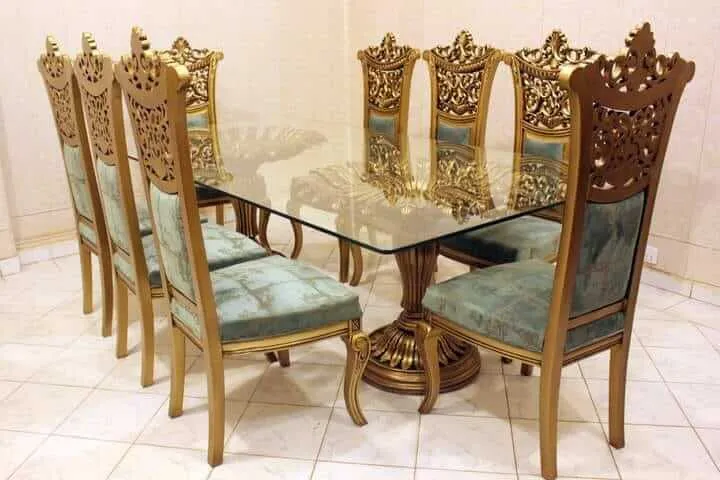 If you are looking for a sofa chiniot furniture level of luxury in your dining room, these high-back chairs with premium cream damask upholstery are the perfect choice. The fabric features elegant floral motifs that complement the stylish bedroom chiniot furniture design themes found in luxury homes. The table is supported by a massive hand-carved double-pedestal base, providing superior stability and a majestic presence. This solid wood construction and the brilliant shahi finish make it an ideal choice for formal family dinners and royal hosting events.