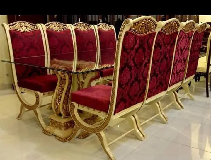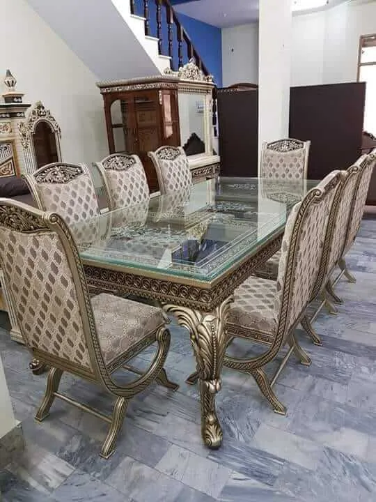 If you are looking for a sofa chiniot furniture level of comfort in your dining area, these high-back chairs are the perfect choice. The backrests feature the iconic “Taj” style carving, often seen in stylish bedroom chiniot furniture design, giving the set a truly majestic look. The antique gold finish is artfully applied to bring out every detail of the solid wood patterns, while the premium beige floral upholstery adds a soft, elegant touch. This Chiniot furniture design is specifically created for those who value authentic Pakistani art and a sophisticated dining experience for their guests and family.