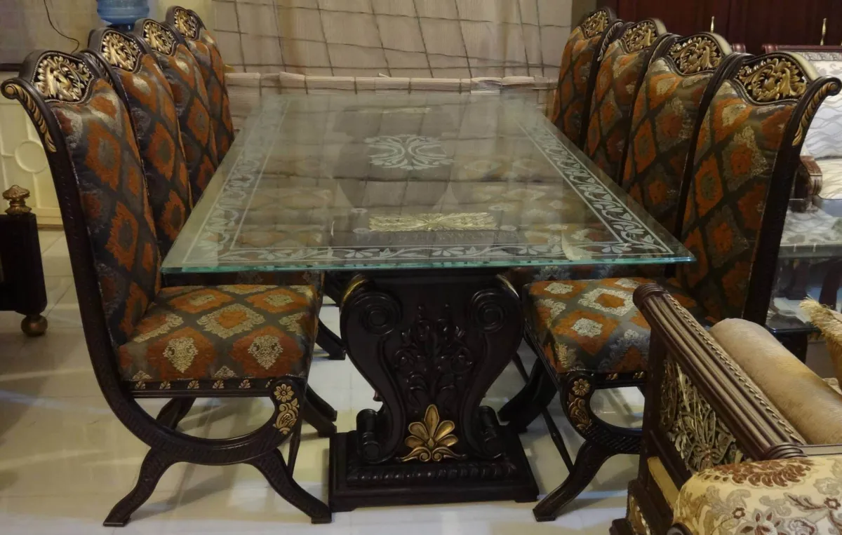 The Chinioti Dining Table Set DTS2 is a spectacular display of traditional craftsmanship from the heart of the Chiniot furniture market. This set is defined by its high-relief floral carvings, which are meticulously hand-carved from seasoned Sheesham wood to ensure a lifetime of durability. The table stands on a magnificent heavy-pedestal base, making it a sturdy and grand centerpiece of wooden simple chiniot furniture that transforms any dining room into a royal hall.