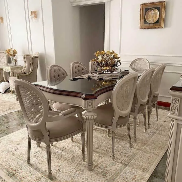 If you are looking for a sofa chiniot furniture level of luxury and comfort for your dining hall, these high-back chairs are the perfect choice. The premium damask upholstery reflects the same elegance found in high-end stylish bedroom chiniot furniture design, creating a cohesive shahi atmosphere throughout your home. The table stands on a massive, intricately carved pedestal base that provides superior stability and a grand presence. This solid wood construction and the radiant golden finish make it an ideal choice for formal family dinners and royal hosting events.