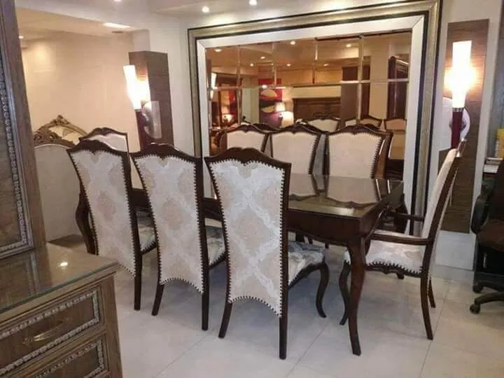 If you are looking for a sofa chiniot furniture level of elegance for your dining area, this high-back design is the perfect choice. The backrests feature deep diamond tufting and a majestic silver “Taj” carving, a signature of stylish bedroom chiniot furniture design adapted for a grand dining experience. The table is supported by a heavy-duty carved pedestal base, showcasing the intricate floral patterns that Chiniot furniture design is famous for worldwide. This solid wood construction and luxurious fabric combination make it an ideal choice for formal gatherings where a royal and contemporary atmosphere is desired.