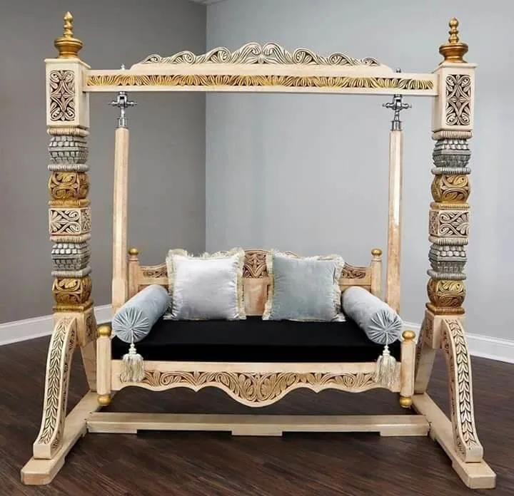 If you desire the relaxation of a sofa chiniot furniture piece with a traditional artistic twist, this wooden simple chiniot furniture swing is the perfect fit. The seat is wide and comfortable, featuring a high-back rest with deep-tufted velvet cushioning that complements a stylish bedroom chiniot furniture layout or a grand living room lounge. Suspended by strong, polished chains, this jhula offers both safety and majestic elegance. The solid wood construction and the expert walnut-gold finish make it an ideal choice for those looking to add a touch of timeless prestige to their lifestyle.