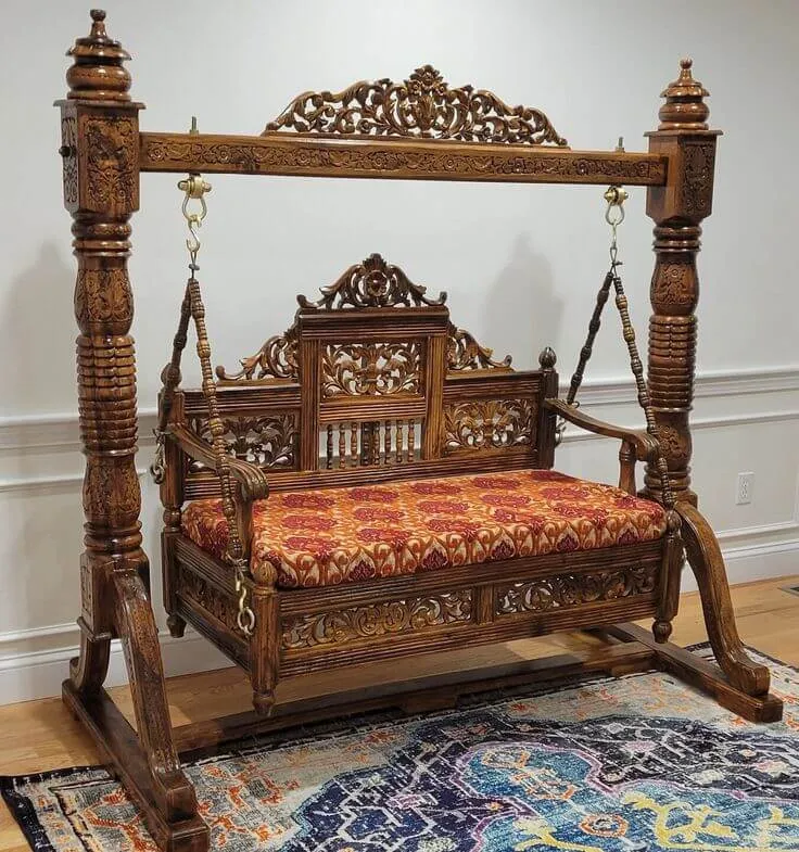 If you are looking for a sofa chiniot furniture level of luxury for your lounge or patio, this wooden simple chiniot furniture swing is the perfect choice. The seat is suspended by heavy-duty brass chains and features a high-back design with supportive cushioning, upholstered in premium fabric. Whether you want to complete a stylish bedroom chiniot furniture theme or create a royal focal point in your living hall, this jhula provides a perfect blend of relaxation and prestige. The solid wood construction and the rich antique finish make it a true symbol of Pakistani craftsmanship.