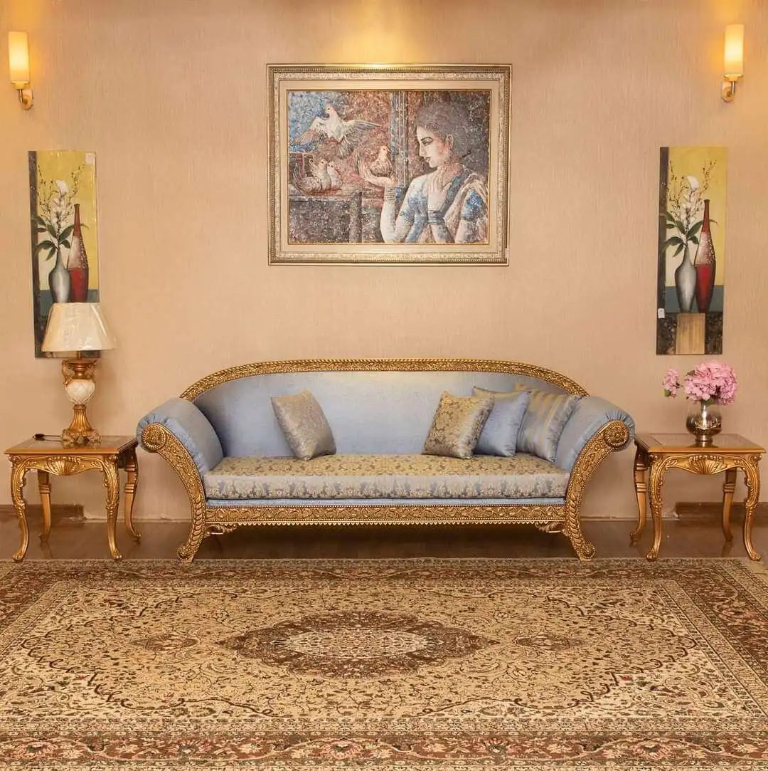 The key highlight of this set is its wide customization options. Although it comes in a standard 7-seater sofa set layout (3+2+1+1), we can customize it into a 5-seater or any seating configuration according to your requirements. You can also choose deco polish colors, paint finishing, and cushion fabric or textures as per your preference to perfectly match your living room environment. This hand-carved wooden sofa is a perfect combination of comfort and durability.