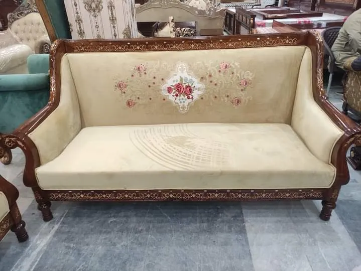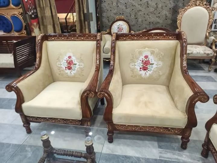 Our Chinioti Sofa Set Design CSD6 is a perfect blend of royal craftsmanship and a calm, serene feel. Its standout feature is the high βTajβ headrest, which is finely hand-carved on Sheesham wood, making it one of the most eye-catching designs in Chinioti sofa sets. The strong wood used in its construction ensures excellent durability, meeting the highest standards of the Chiniot furniture market.